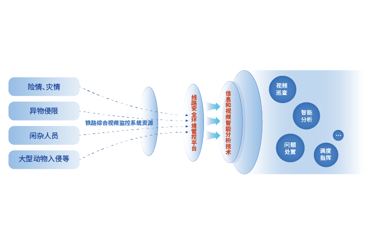 “线路安全环境管控平台”是利用铁路综合视频监控系统资源,结合新一代信息技术和视频智能分析技术,针对线路区间内可能危及行车和设备安全的险情、灾情、异物侵限、闲杂人员或大型动物入侵等事件进行监控与管控。平台具备视频巡查、视频联动、智能分析、预警确认、问题处置、调度指挥和现场巡查等多项功能,形成了一套综合性安全保障系统。